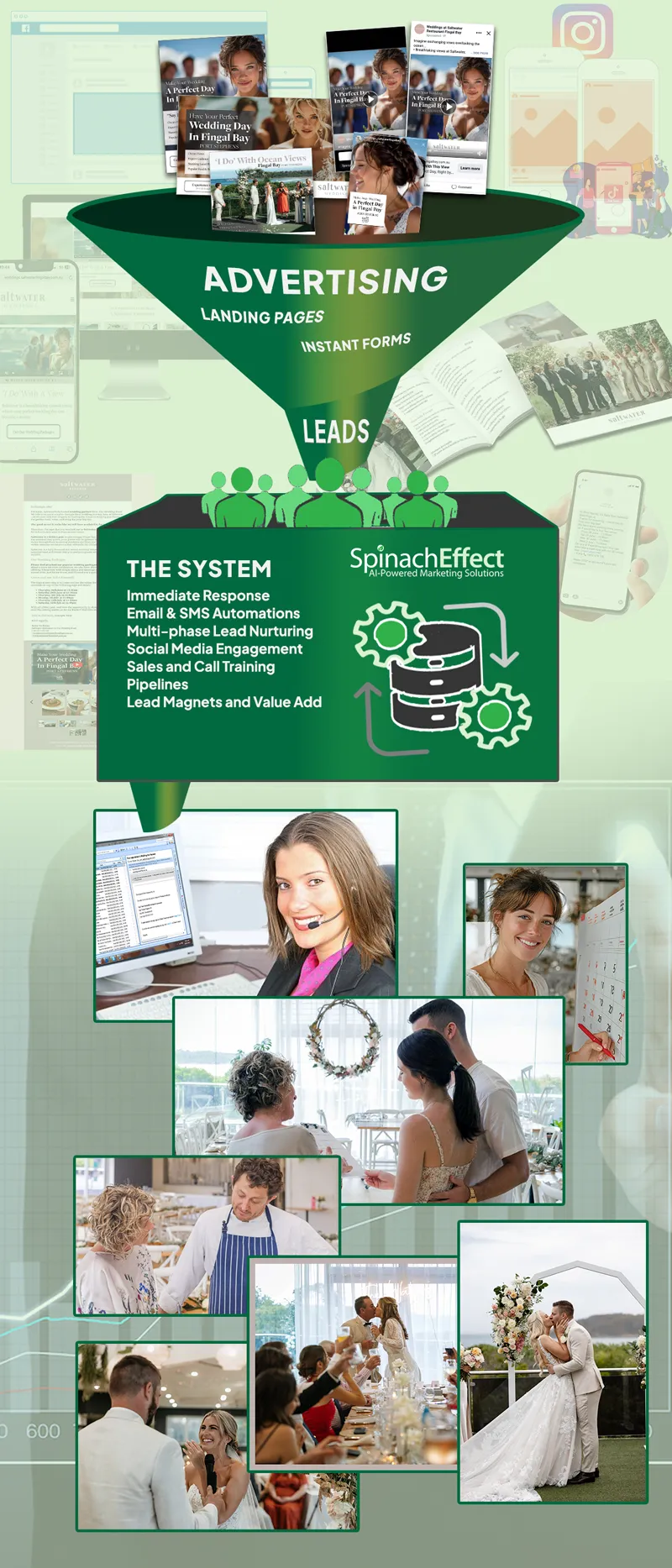 We built a campaign that combined cutting-edge AI video production and sound editing to create ads that are generating enquiries at under $6 per lead. Our 30-day lead nurturing sequence guides brides from first click to booking a guided site tour of the venue. Using GoHighLevel, we empowered the client with automated SMS and email follow-up, social media scheduling, and custom landing pages.
